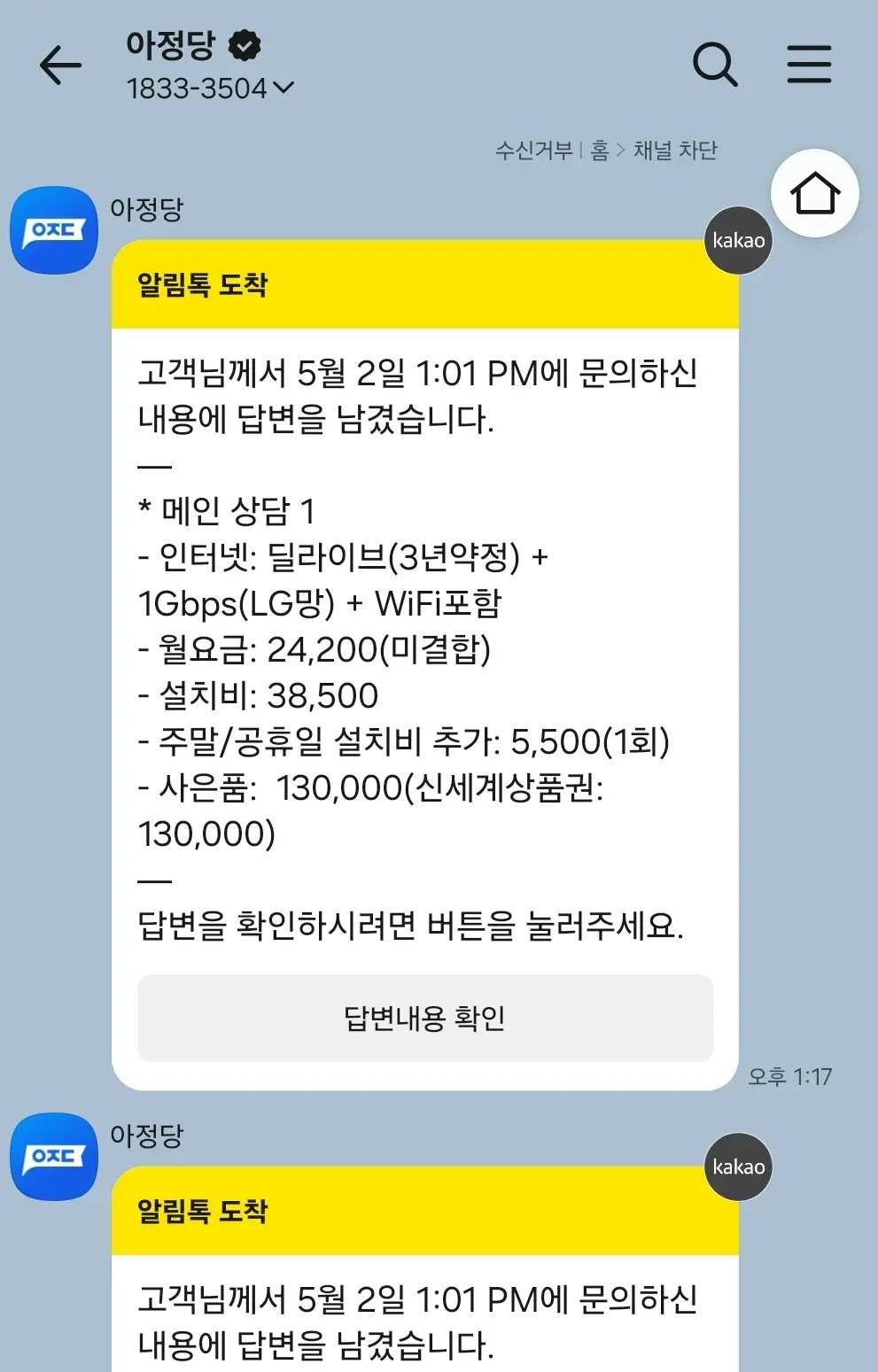 댓글 1관심글 댓글 알림아정당 댓글 복사안녕하세요 고객님, 번거롭게 해드려 정말 죄송합니다. 문의 주신 내용 확인 후, 처음 상담받으셨던 카카오톡 채널을 통해 다시 안내드리겠습니다.2025.10.14 10:44