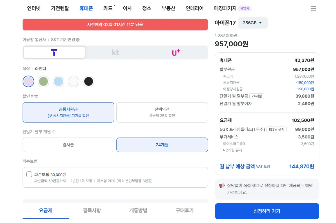 아정당을 통해서 SKT로 휴대폰 및 인터넷+IPTV 신규 가입 신청을 하였습니다