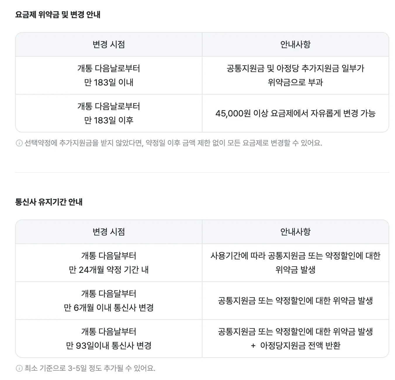 만 93일 이내 해지 시 모든 지원금 반환 만 6개월 이내 해지 시 통신사 지원금만 반환 24개월 이내 해지 시 사용일수에 따른 통신사 지원금 반환