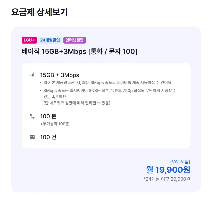 댓글 1관심글 댓글 알림아정당 댓글 복사안녕하세요! 고객님!아정당입니다.현재 문의량이 많아 답변이 지연되어 죄송합니다.먼저 문의해주신 글로 답변드린 내용이라간단히 답변드리겠습니다!해당 요금제도 결합이 가능하며, 기존 결합상태에 따라달라질 수 있습니다.추가적인 문의사항은 아래 방법을통하셔도 안내받을 수 있습니다~아정당 대표번호 : 1833-3504아정당 카카오톡 : https://pf.kakao.com/_RGxcFxb아정당 채널톡 : 홈페이지 우측하단 > 상담하기감사합니다 😊2026.01.15 16:32