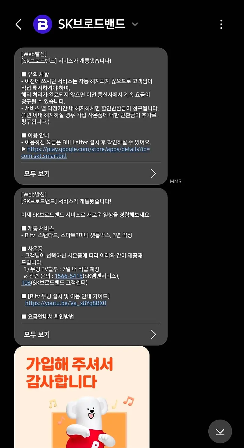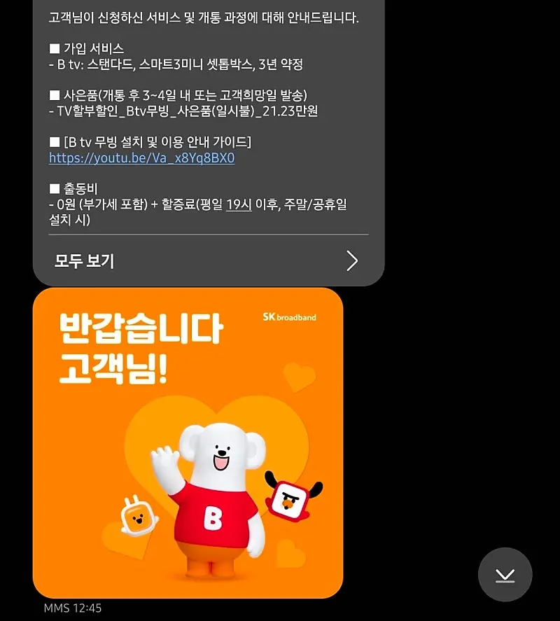 이사가 좀 늦어졌는데도 불구하고, SK 설치 기사님께서 약속 시간보다 늦은 시간에 방문해 주셔서 설치 작업을 완벽히 진행하여주셨습니다. 설치 후에는 인터넷 속도 테스트와 리모컨 등 사용 방법까지 친절하게 설명해 주셔서 만족스러웠습니다. 품질과 속도가 현재 아주 최상입니다. 또한 저와 자녀의 휴대폰 SKT 유심 개통 및 결합까지 아정당 상담사님과 SKT 상담사님의 친절한 안내 및 진행으로 지금 다섯명의 우리 가족이 TV, 인터넷, 와이파이, 휴대폰까지 만족하며 사용하고 있습니다.
