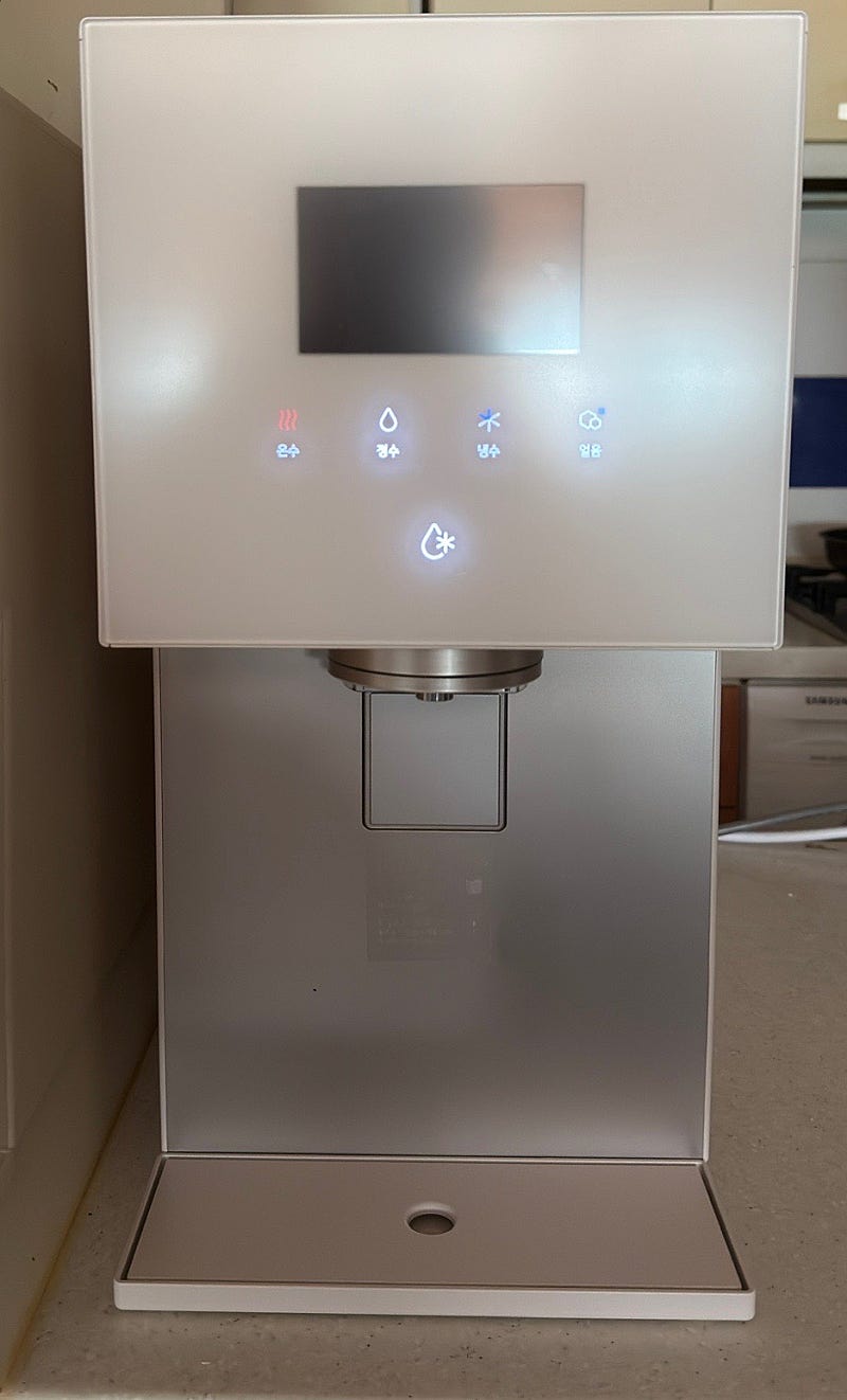 일단 디자인이 넘 내스타일.. 근데 생각보다 덩치가 커서 놀랬어요 정수기는 다 쪼만할줄 알았는데.. 암튼 요즘은 정수기가 와이파이도 되고… 참 신기하네요 싱기한 기능이 넘마나!! 아 근데 이 제품은 온수가 90도 까지밖에 안되요 ㅜㅜ그걸 설치하고 알았지모야 참고하세용! 아 글구 설치기사님두 짱친절