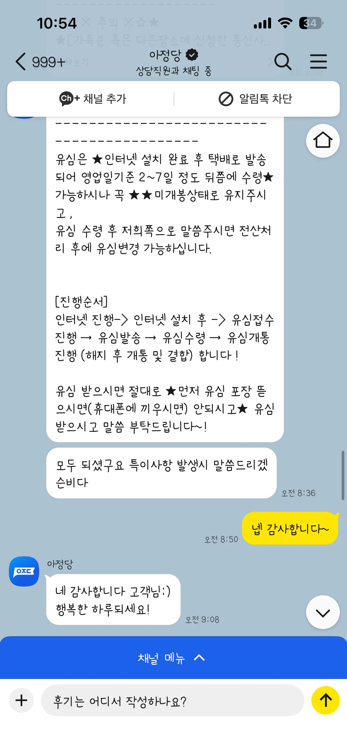 * 본인 성명 / 지역(시 구)/ 연락처 : 김보* (앞두글자) / 서울 관악구 / 2005(중간4글자) * 요금 상품 : sk t_기가인터넷라이트 / 라이트 / 스마트3셋톱 * 개통 일자 : 2020년 3월 27일 제가 몇군데를 찾아봤는데 아정당같이 정직하고 친절하게 해주시는곳 없는거 같아요. 저도 첨하는건데 여러군데 통화해본결과 여기가 가장 베스트였습니다! 다른곳과 sk본사는 통화 후 계속연락옵니다... 가입하라고 그리고 심지어 sk본사는 상담원에따라 가격과 혜택이 자기마음데로 더라구요. 아정당은 제가 전화하고 의심스럽기도해서 여러번 통화한 후에 결정했어요. (심지어 상담사님에게 사기아니냐고 ᄏᄏ물었어요..) 그때마다 상담사님이 친절하고 또 정확하게 어떤 제품을 가족들이 쓰고 계신지 SKT인지 SKb인지 정확하게 해야 할인도 또 다를수있다고 sk본사는 딱히 그런것보다 가입하라는 늬앙스가 더 컸습니다. 그래서 더 아정당을 믿고 설치를 할 수 밖에 없었어요 ᄏᄏ 아정당이 sk본사같습니다. 예전에 쓰던 kt도 6년이 다됐는데 저가 호구였긴하지만 ᄏᄏ 인터넷도 느리고 잘 끊겼어요. 여기저기 찾던중 sk결합상품과 혜택 그리고 친절하고 정확한 내용에 가입하였습니당 ᄏᄏ 인터넷..개빨라염 전화 드릴때마다 정확하고 빠르게 그리고 친절하기까지. 기분 좋게 설치가입하게 되어 저도 기분좋은 가입이였습니다. 약정이 끝난 후 다시 찾을것 같습니다.