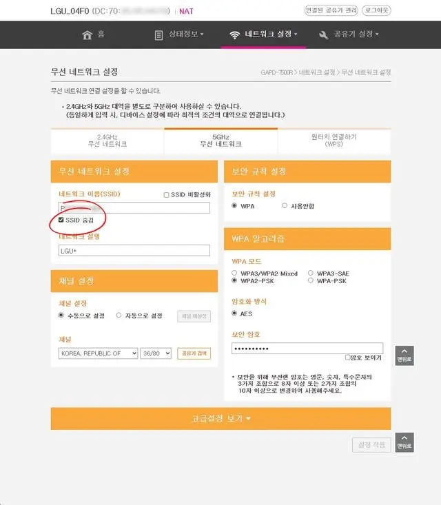 SSID 숨김도 지원되어 동네방네 내 W-Fi 신호를 광고하지 않으려면 꺼버립니다.