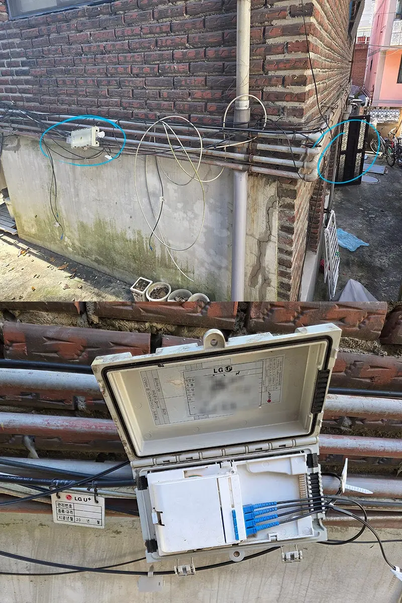 설치 기사님이 몇 집 건너서 광분배함이 있으면 케이블 당겨 오면서 거쳐오는 건물 이곳 저곳에 고정하느라
