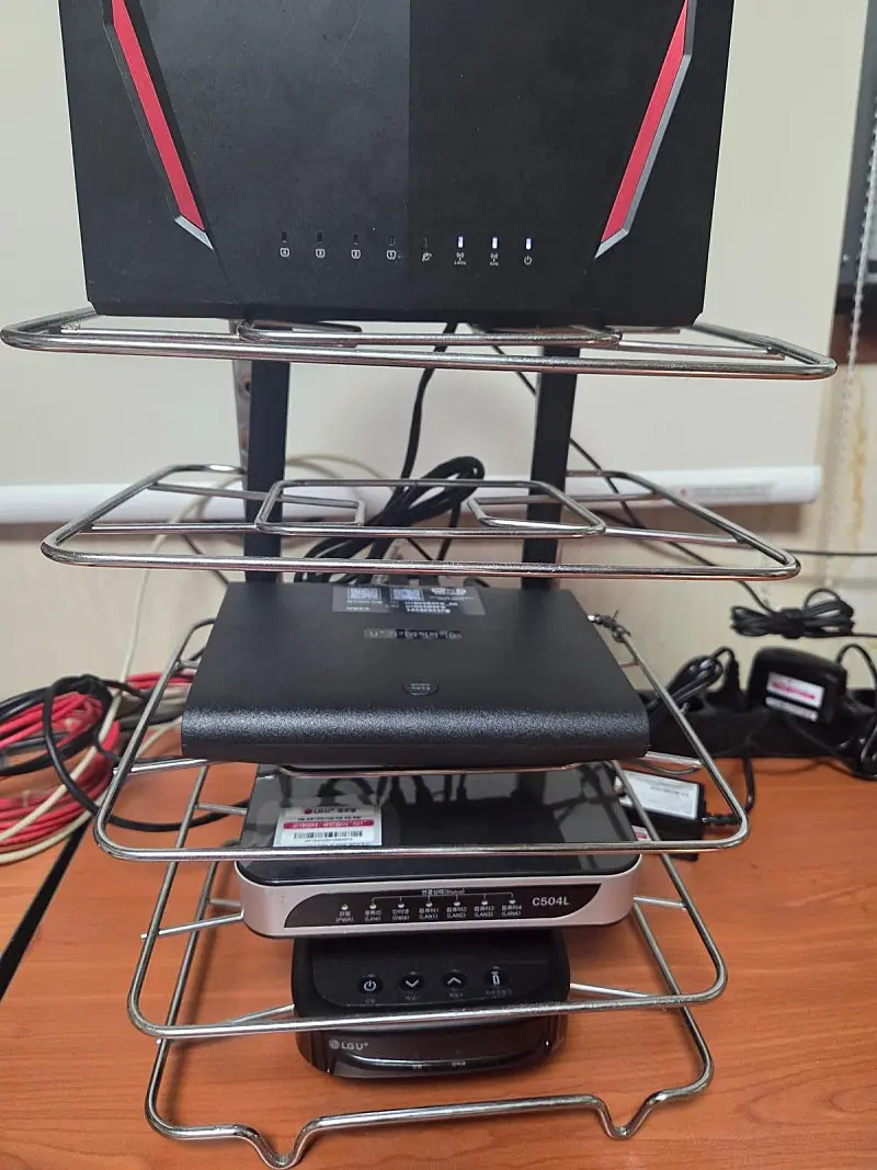 저는 통신 장비들을 후라이팬 거치대에 차곡 차곡 올려서 사용합니다.