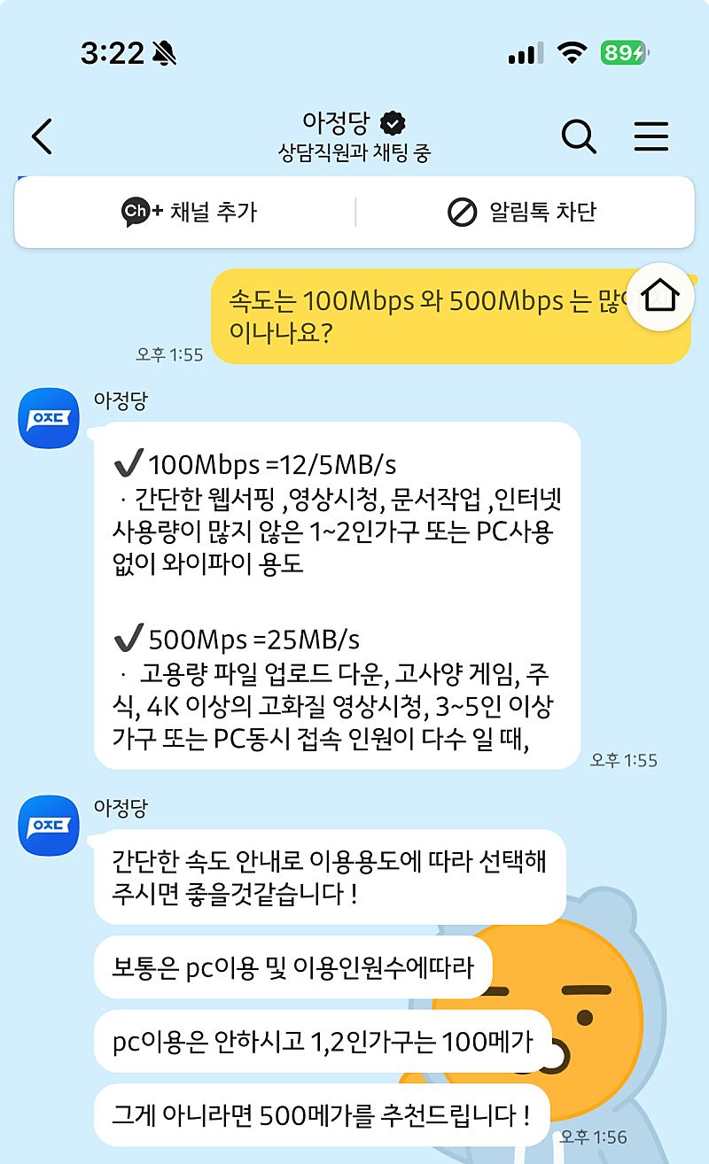 넷플릭스나 유튜브만 봐도 충분해서 인터넷티비는 신청하지 않았습니다. 가구원수가 많지 않아 요금제는 가장 저렴한 요금제인 100메가로 추천 받았습니다. 인터넷 속도별로 어떤 차이점이 있는지 아정당 상담직원분이 자세하게 설명해주셨습니다. 무조건 비싼 요금제로 권유하기보다 제 상황에 맞게 추천해주셨기에 신뢰가 갔습니다.