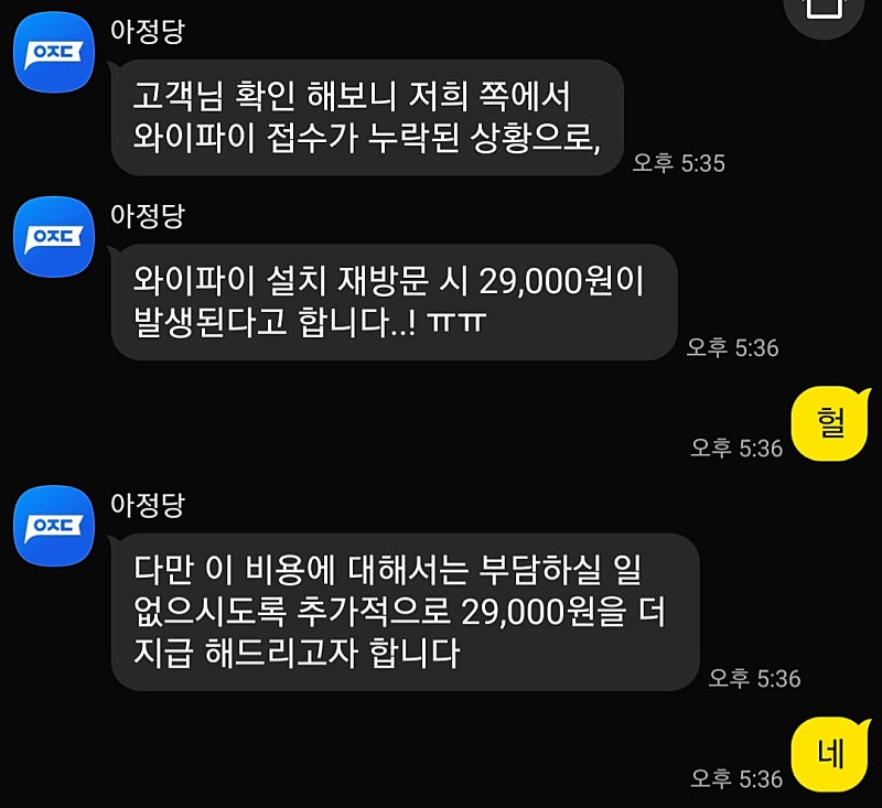 이 과정에서 발생하는 출동료(설치비) 29,000은 아정당 측에서 지급해줬습니다.!!