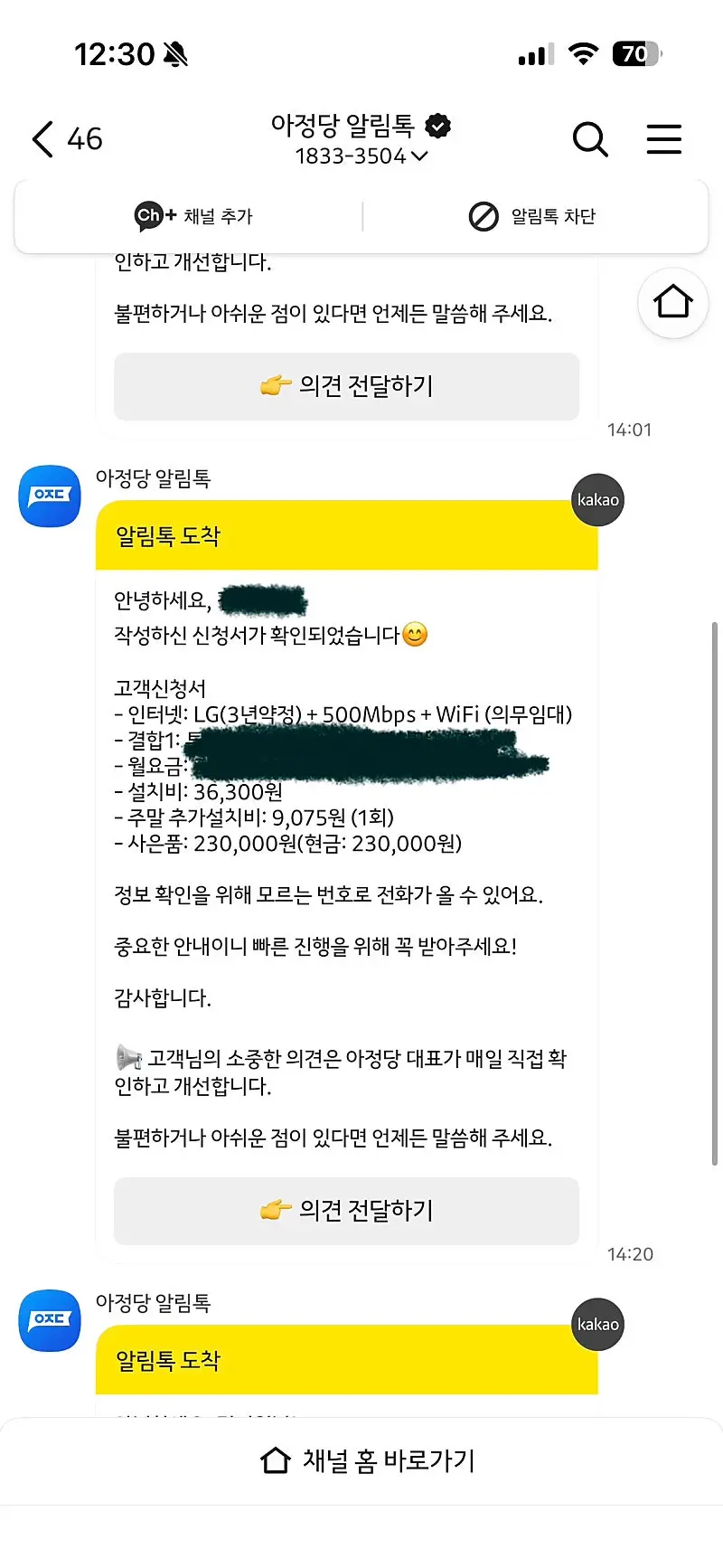 설치하려는 요금을 확인 해주시고 지원금 안내도 해주시는데 이때 저한테 어떤 요금이 더 잘 맞을지 , 더 할인 받을 수 있는 조건은 없는지 조언도 해주셔서 감사했습니다!
