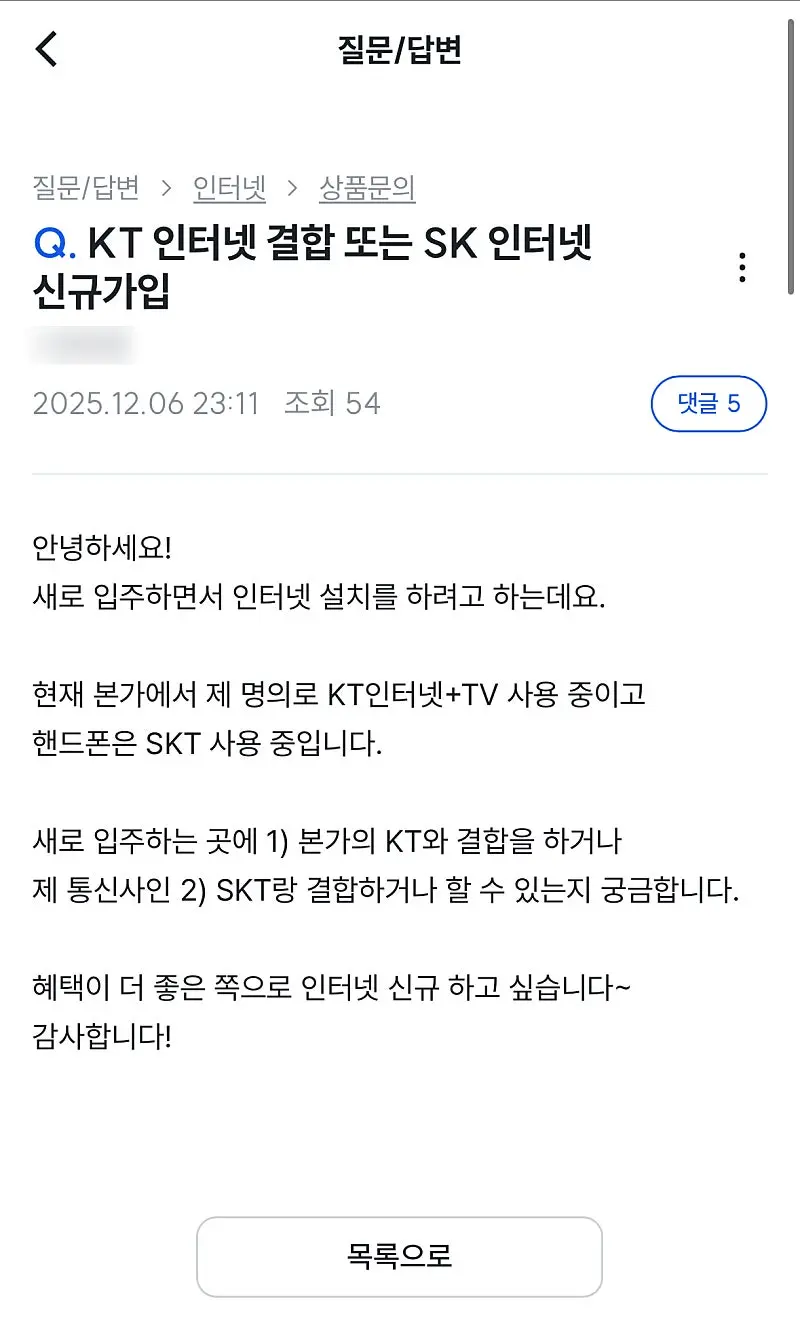 현재 SKT 핸드폰 요금제를 사용하고 있어서 결합 할인이 가능한 SKT 인터넷으로 결정했습니다.
