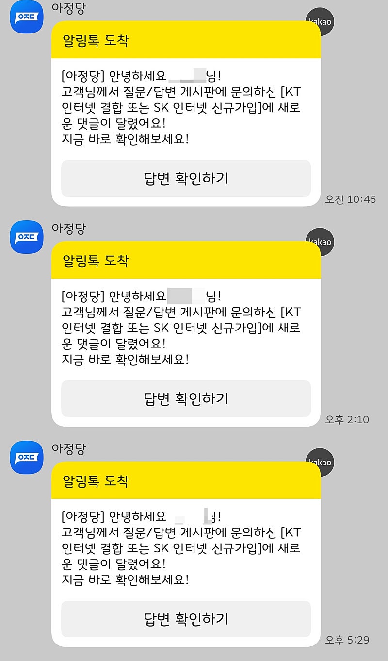 질문에 대한 답변도 빠르게 달리고, 답변이 달리면 이렇게 알림톡도 와서 상담 과정이 정말 편했습니다~