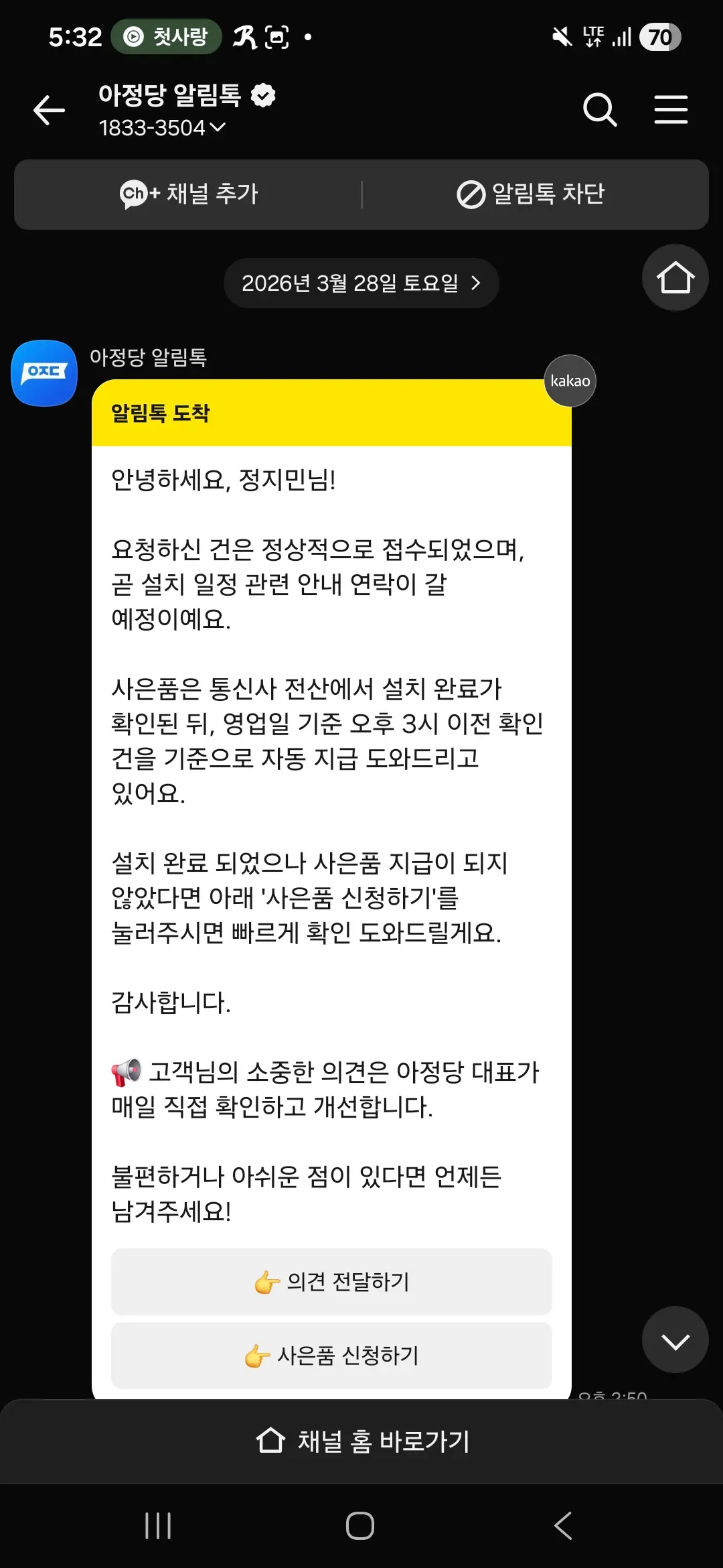 십여년만에 바꿨습니다. 속도도 빠르고 무엇보다 친절하고 중간중간 연락 피드백이 너무 좋았습니다. 특히 사운드바 센탑박스도 좋아요 ᄒᄒ 정수기도 아정당에서 바꾸려고 벌써 예약해놨네요 ᄒᄒ 선정리도 무척 깔끔하게 해주셨습니다. 화질도 엄청좋아요 약정 끝난뒤에도 다른거로 갈아타는것보다 아정당에서 또 바꾸고 싶습니다. 정수기외 냉장고 침대 세탁기 건조기 등등 가전제품들 사용하기 무척이나 편리하고 세상 좋아진거같습니다.