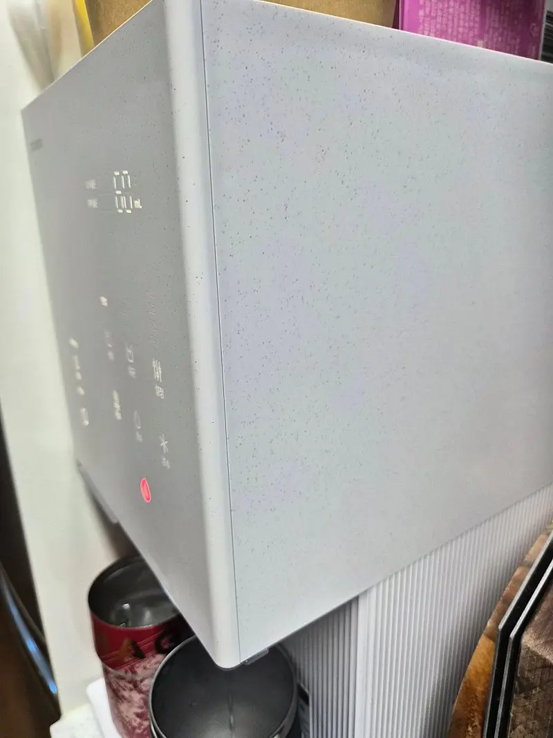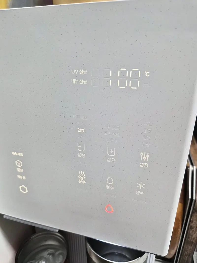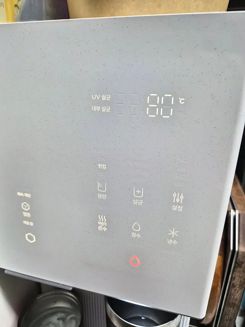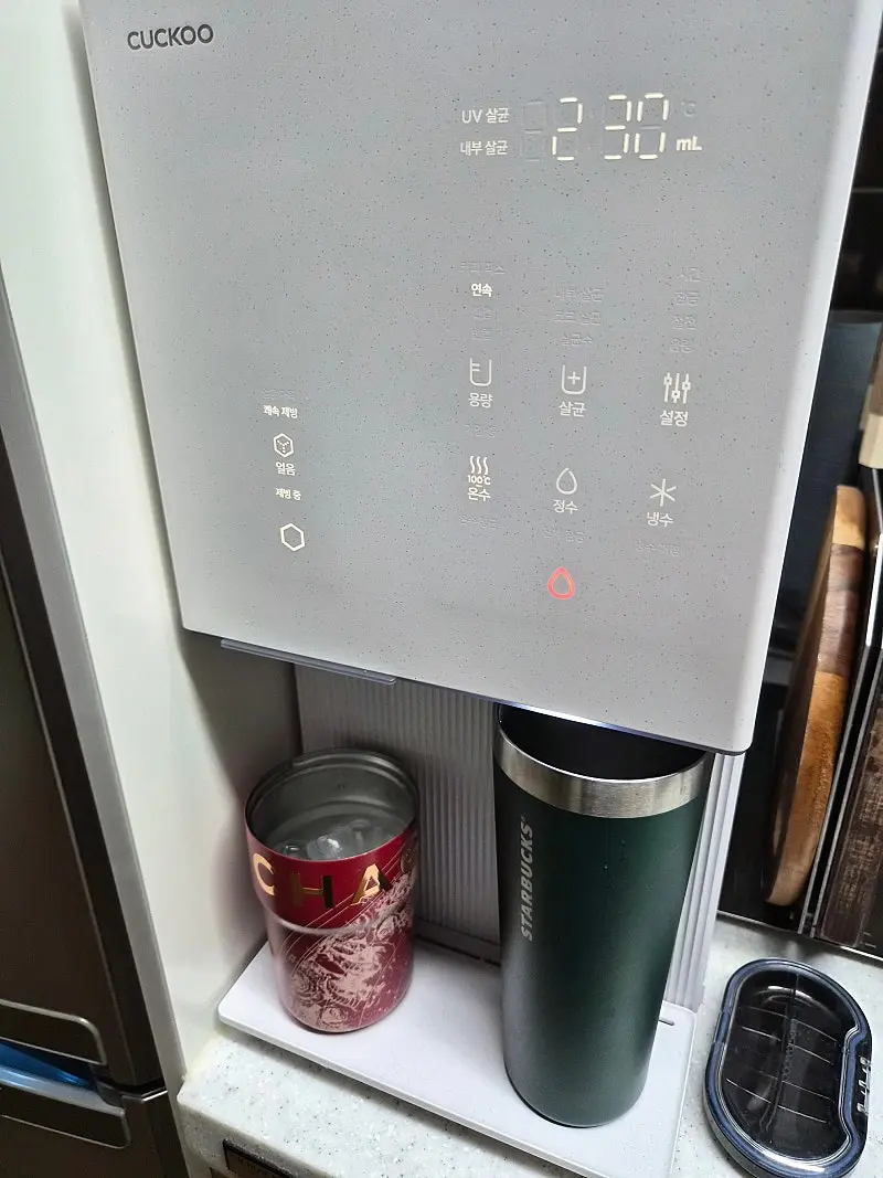 디자인도 예쁘고. 정면상단 및 측면 대리석같은 느낌의 칼라임. 코웨이 정수기는 코크가 아래로 내려와서 긴 텀블러가 안들어갔는데 이번에 선택한 쿠쿠 정수기는 600ml 정도의 텀블러도 들어감! 온수도 단계별 설정가능해서 좋고, 얼음도 탄탄함. 무엇보다 사은품 혜택도 좋은 아정당에서 빠르게 잘 설치완료!