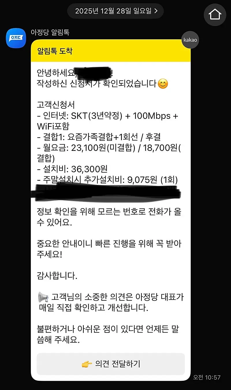 처음 인터넷 설치를 알아볼 때 솔직히 어디서부터 시작해야 할 지 막막했는데요 ㅎ... 통신사마다 요금도 다르고 사은품 조건도 다 달라서 괜히 아무거나 선택해서 손해보는 건 아닐까? 하면서 걱정을 많이 했거든요. 그런데 아정당을 선택한 보람이 있는 것 같아요. 우선 상담과정이 정말 친절하고 좋았어요. 무조건 비싼 상품을 권하거나 특정 통신사로 유도하는 느낌이 전혀 들지 않았고 제가 인터넷을 어떻게 사용하고 있는지와 휴대폰 요금제를 확인해주셔서 결합이 가능한지 등등 제 상황에 맞는 상품을 추천해주셨습니다. 그리고 설명이 정말 이해하기 쉬웠다는 점이에요. 핵심만 콕 집어서 설명해주셔서 저도 부담없이 결정할 수 있었습니다.