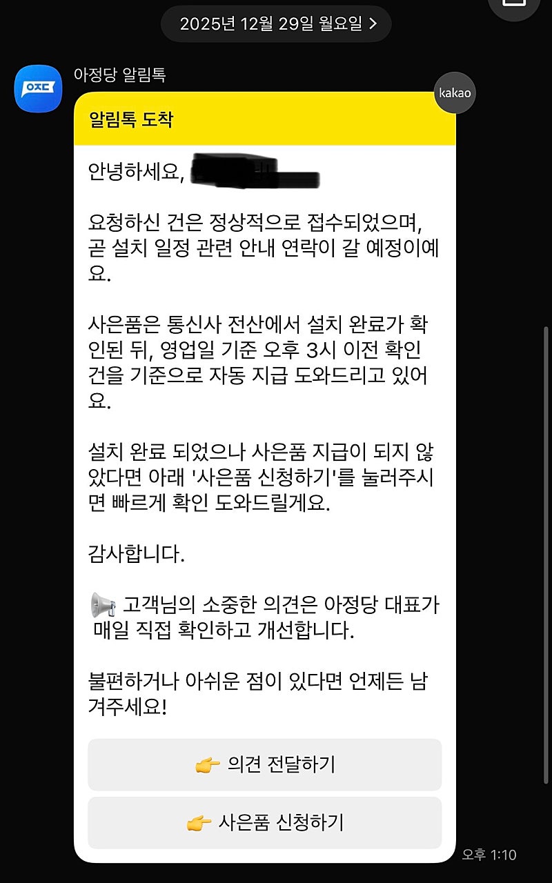 정말 설치당일 주시더라구요? 솔직히 놀랐어요. 무서울 정도로 ㅎㅎ 보통은 가입하고 사은품 지급을 미루는 경우가 많잖아요... 아니면 이것저것 체크해야되는 경우가 많다던가... 그런데 상담원분이 설명해주신대로 바로 진행이 되었고 지급 받았어요. 타 업체는 사용해보지 않았지만 당일 친구들이 놀러와서 얘기해봤는데 다들 놀라더라구요. 저의 만족도는 1000%인 것 같습니다 ^_^ 다음에는 다름 서비스도 이용해보고 싶습니다.