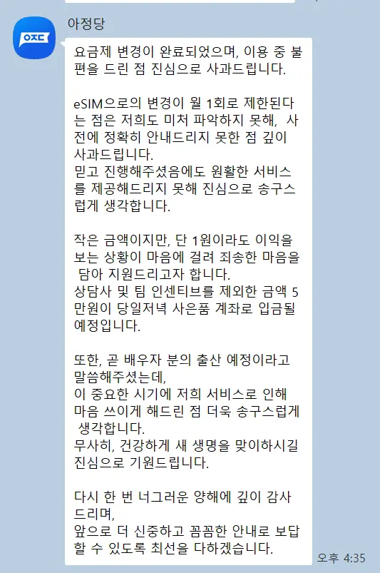 최종적으로 아정당은 장문의 사과와 함께 5만 원 보상금을 제공했습니다. 이는 성의 있는 조치로 느껴졌으나, 과정에서 겪은 불편을 완전히 상쇄하지는 못했습니다.