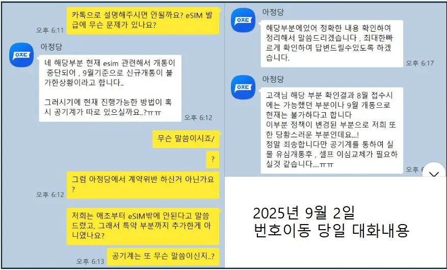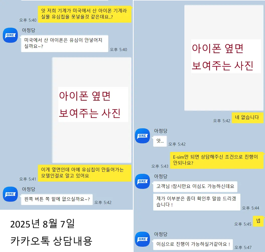 카카오톡과 전화 상담을 반복하며, 매번 eSIM 전용 단말기임을 설명해야 했습니다. 상담 과정에서 정보 전달이 일관되지 않았고, 고객센터 응답이 느려 불편함이 컸습니다.