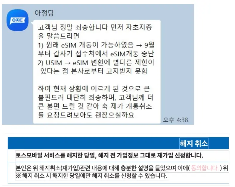 하지만, USIM 개통 후 eSIM으로 전환하려 했으나, 당월 내 2회 이상 개통이 불가능하다는 이유로 실패했습니다. 아정당 고객센터에 문의했으나 응답이 느렸고, 결국 SKT 직영점을 방문했습니다. 직영점에서는 이미 SKT로 개통된 상태라 eSIM 전환을 위해 기존 통신사(토스 모바일)로 복구 후 재이동해야 한다고 안내받았습니다.