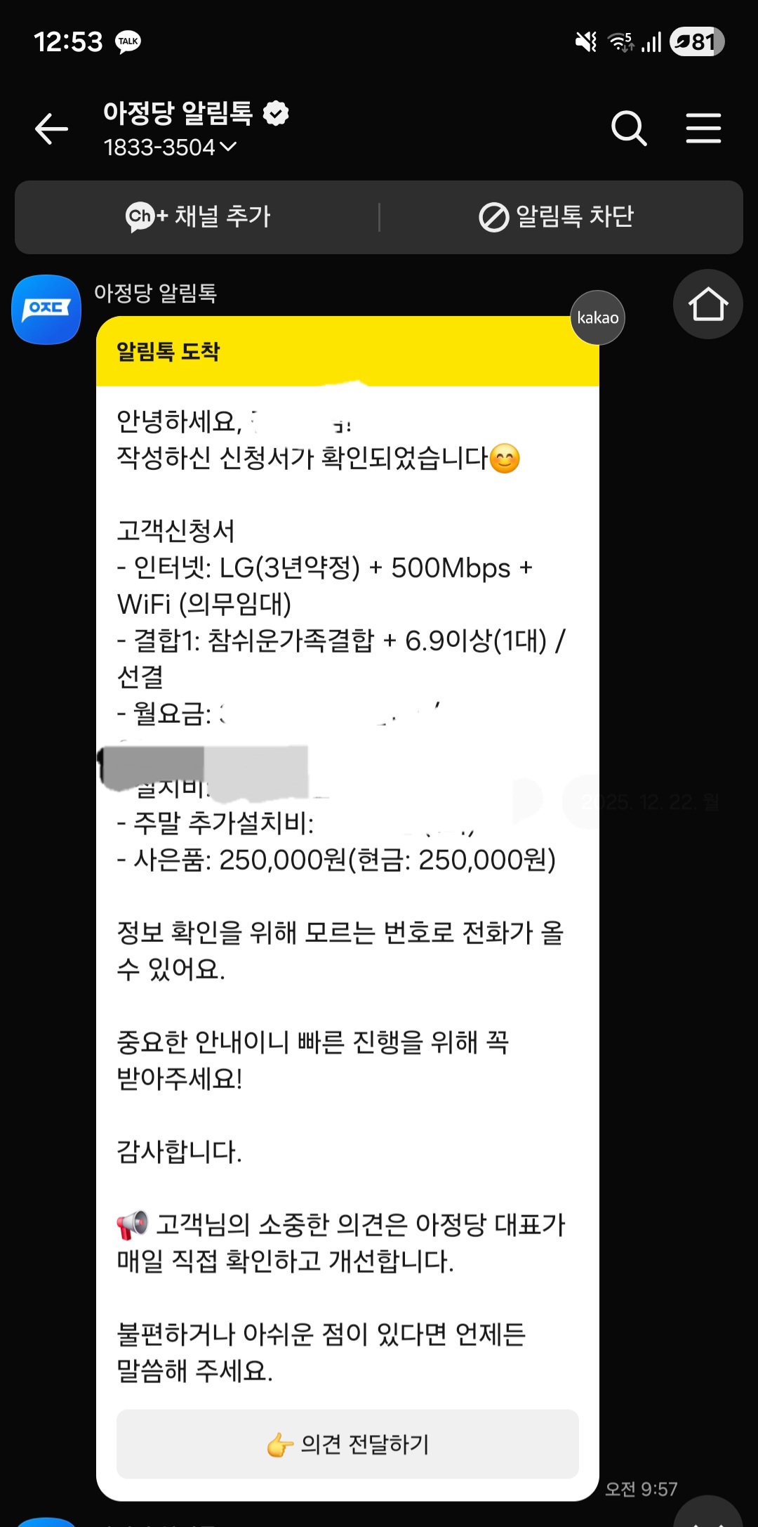 잘나옴^^ Kt인터넷 평생 쓰다가 약정이 만료되서 한곳만 너뮤오래씀..그래서이래저래 알아보다가 아정당이라는 곳을 알게되었어요 상품권이어닌 현금 주더라구요 가입조건두 맘에 들고 넷플릭스 티비 직장인이라 채널 많은건 별 필요가 없었어요 주로 보는건 유툽이나 넷플릭스 제일 많이 보는것 같아요 그리고 주말에는 정규방송밀린것 보는 정도?ᄒᄒ 나머진 바빠서 채널 이랴저래 돌일 시간 없꼬 ᄏᄏ그리고 상담해 주시는분 찐짜 친절 하세요(반해뜸)ᄏᄏ 불편한건 통화연결음이 홈피에 없어 구글플래이 접속해서 들어가야 한다는거 제가 잘멀라서 그런거 일수도 ᄊ고 암튼 불편했어요 ᅲᅲ 좀더 알아바야 핫것 같아요 연결음할때마다 구글에 들어가서 인증 해야 하는건지,,,아맛다 설치 기사분 설치한는데 약간의 어려움도 있섰지만 것도 해결되고 티비설정도 잘 해주시고 넷플릭스도 잘 설명해 주시고 좋았어요^^* 3년 동안 잘 쓰겠습니다 마지막으로 아정당으로 인터넷 가입할수 있어서 너무 조아요 감사합니다~~!!!! 맘에듬!!