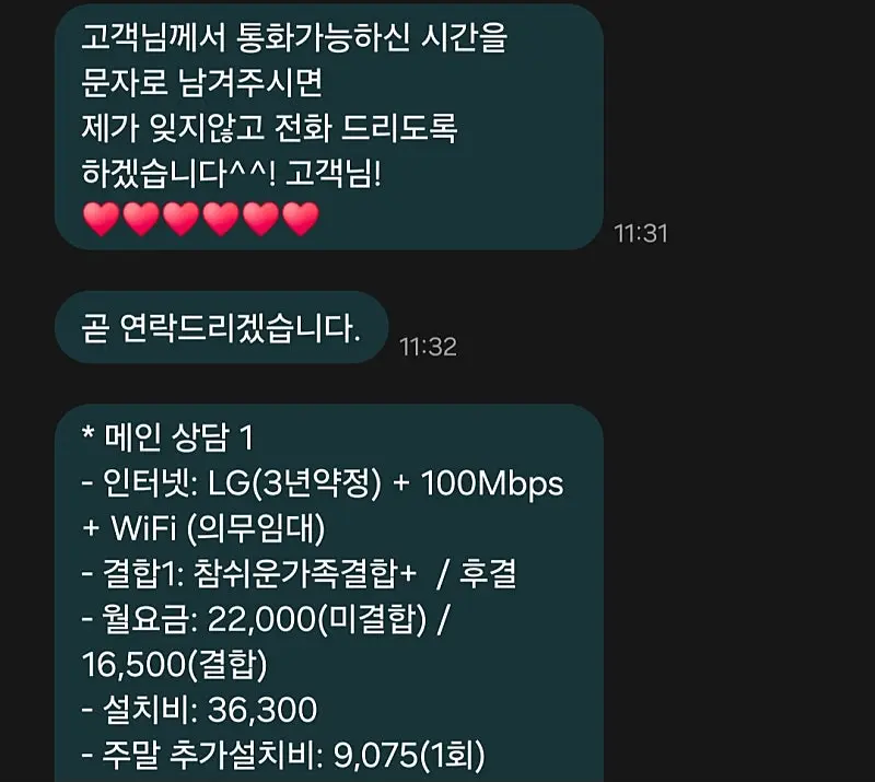 - 일단 저는 알뜰 요금제로도 바꿀 생각이 있었기 떄문에 유선으로 상담원분과 상담하여 1인가구가 혼자 살면서 쓰기 적당한 인터넷 요금제와 알뜰요금제 결합할인이 가능한 요금제를 추천받았습니다 약 30분간 상담후에 꼼꼼하게 내용을 정리해서 다시 보내주셔서, 믿고 설치를 결정하게 되었습니다.