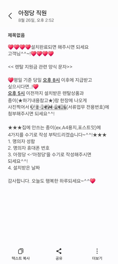 설치 전에 따로 연락 와서 시간 확인 → 기사님 도착 전에 문자까지 딱딱 와서