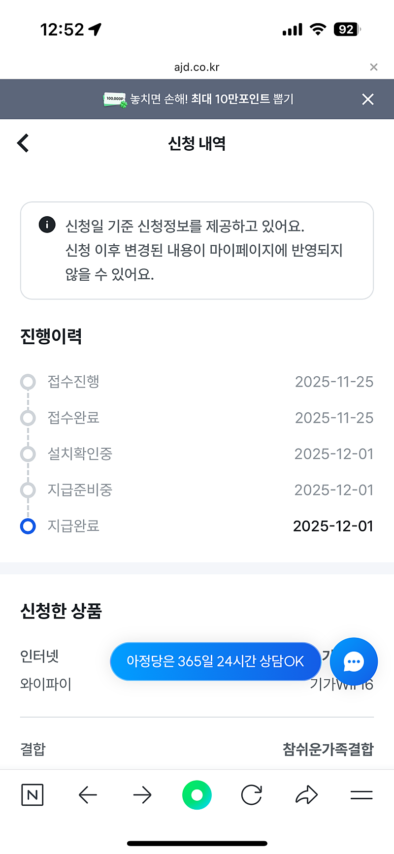 작은 업체부터 통신사별 다 비교해보았는데 아정당에서 설명해주신 비교 내용이 좋아서 아정당에서 하게 되었고 설치일자 당일 일찍 오셔서 빠르게 설치해주셨어요.