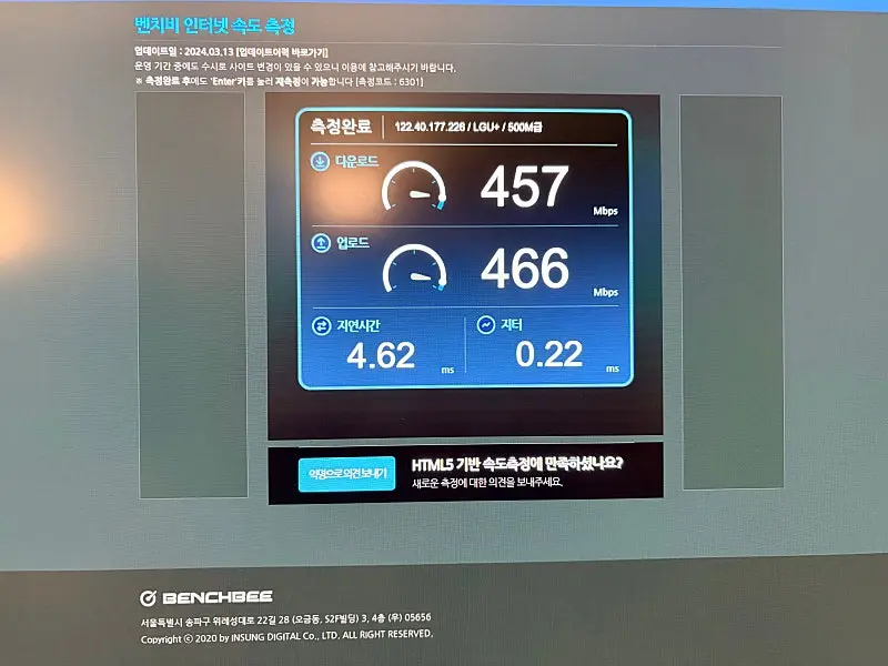 인터넷 속도 측정 결과도 아주 만족할만 하게 나오네요!