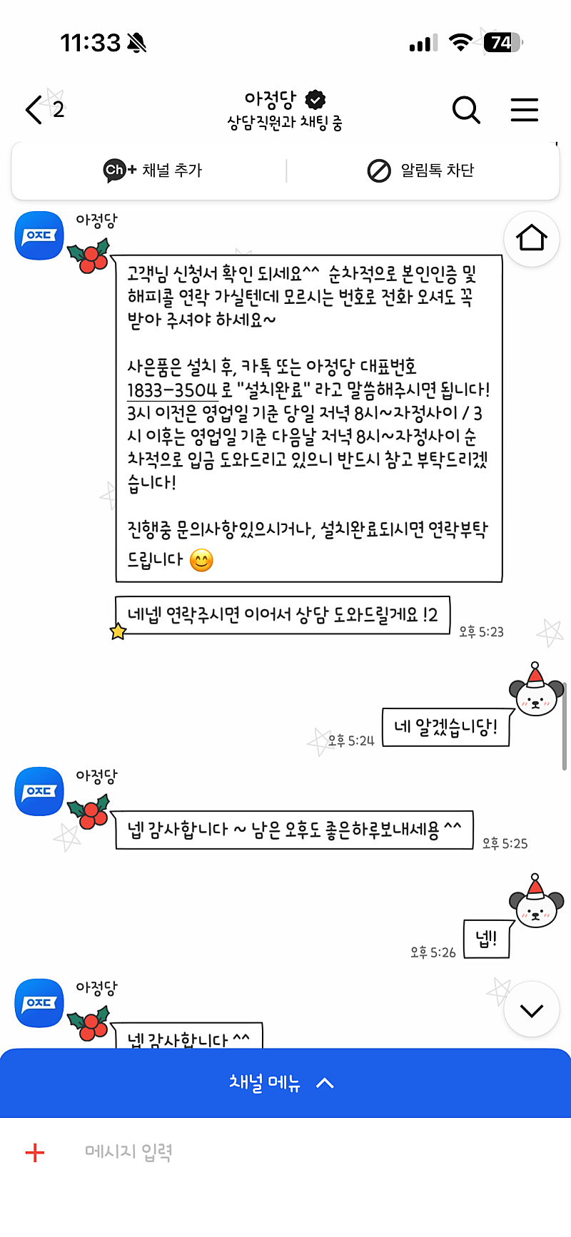 결정하게 됐어요. 아정당 홈페이지로 신청하고 카카오톡 1:1 대화로 진행상황을
