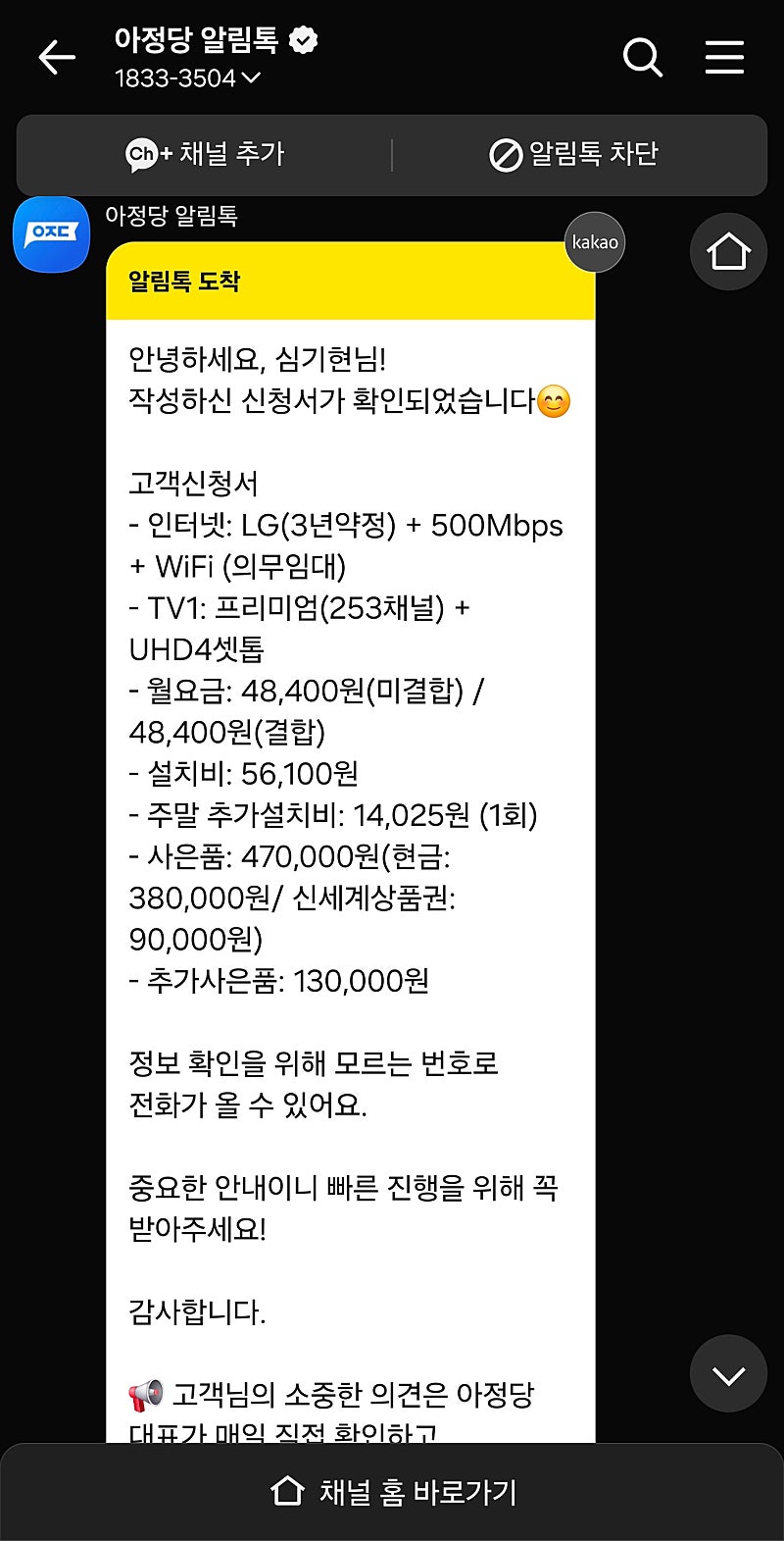 박건희 매니저님이 가격 비교도 친절하고 꼼꼼하게 10원단위까지 알려주셔서 좋았습니다~ 예전에 이름 없는곳에서 가입할때는 현금지원 자체가 없었습니다. 그때는 상품권만 받았는데 이번에는 현금을 인터넷 설치후 얼마 안있어 바로 입금을 해주는것이 좋았습니다~ 또 일처리가 엄청 빨라서 좋았습니다. 주말에 상담후 월요일에 업무때문에 바로 설치해달라고 부탁드렸습니다. 우선 설치로 바로 월요일에 빠르게 되었고 LG U플러스에서 나온 기사님 또한 너무 친절했습니다~ 이것또한 아정당에서 다 꼼꼼히 챙겨주시더라구요ㅎ 이런시스템이라면 정수기도 곧 바꿔야 하는데 아정당에서 바꾸는게 속도편하고 신경쓸일도 없이 딱딱 일처리해주니 다른곳에서 비교할 필요도 없겠습니다. 아무튼 엄청 추천합니다^^