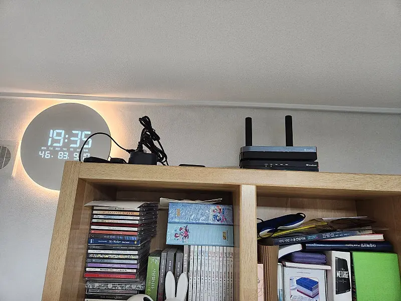 책장 위에 보이지 않게 깔끔하게 설치되어 기존 인테리어를 해치지 않아서 좋았습니다