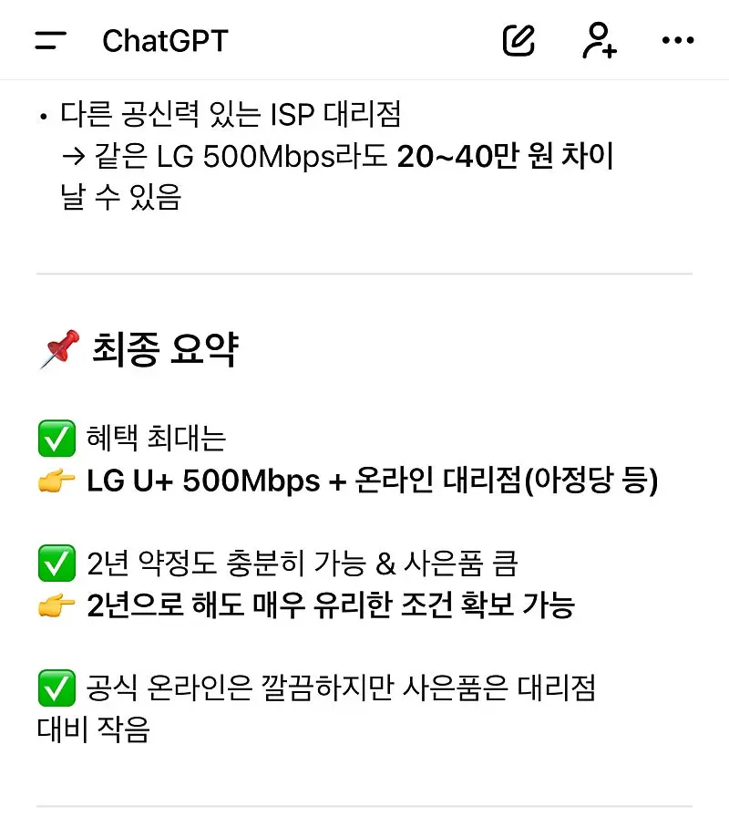 원래 휴대폰은 KT라서 결합할인을 받으려고 했습니다. 그런데 아정당에서 맞춤형 검색을 했을 때 LG U+가 월 요금, 사은품을 고려했을 때 가장 좋은 선택이라고 판단했습니다.