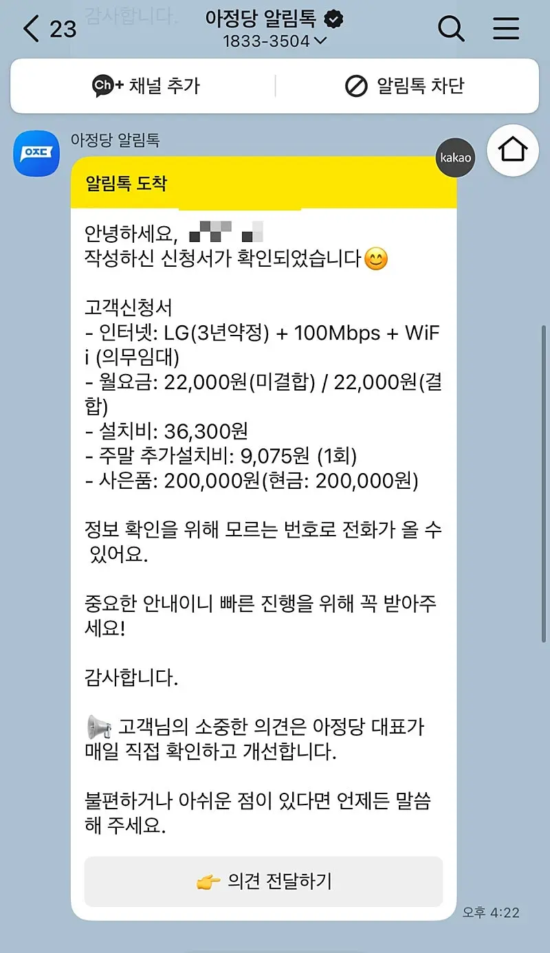 가입 과정은 간단했습니다. 맞춤형 검색 후 신청을 했고, 중간에 오는 전화를 받으면 설치 날짜가 확정이 되었습니다. 날짜 확정 후 기사님이 오셔서 30분만에 설치 끝내시고 마무리까지 다 해주셔서 제가 크게 할 것은 없었습니다.