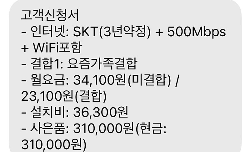 휴대폰이 SKT라 결합 할인 혜택을 받을 수 있었고, 속도나 품질 면에서도 만족도가 높아 SKT 인터넷을 선택하게 되었습니다.