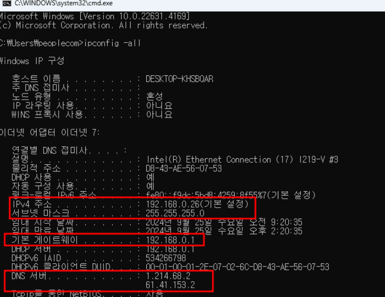 ip주소, dns 정보 등을 확인할 수 있습니다.