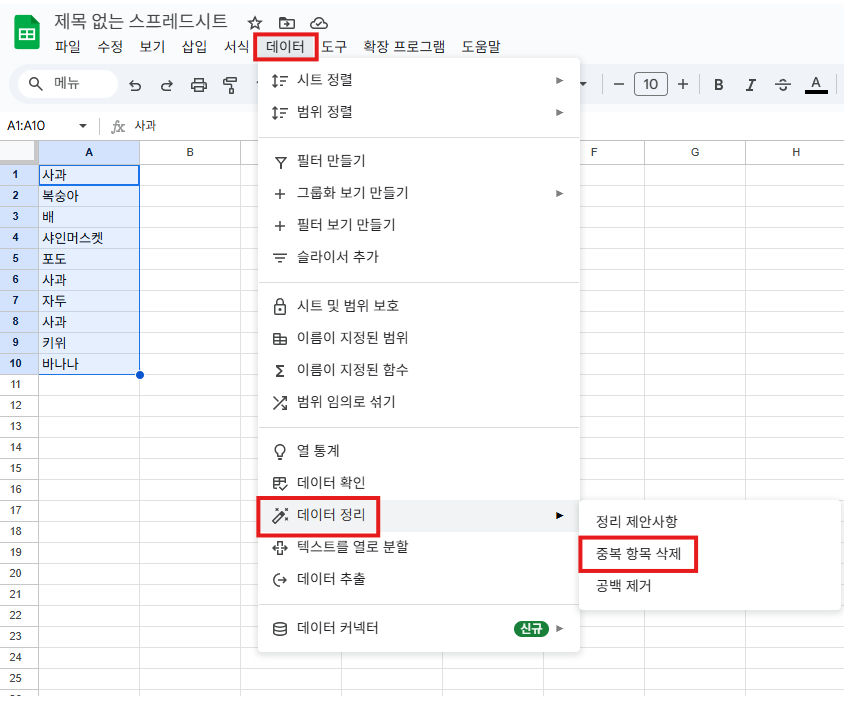 1. 메뉴 기능으로 중복값 한 번에 삭제하기