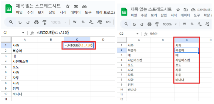 엔터를 누르면 지정한 범위(A1:A10)에서 중복값 제거된 고유값 리스트 새로 표시