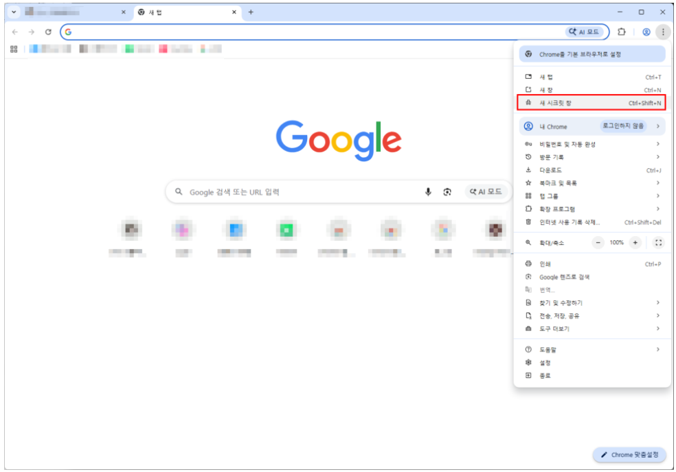 - 메뉴에서 ‘새 시크릿 창’ 선택