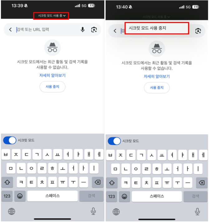 - 화면 상단에서 아래로 내린 뒤 ‘시크릿 모드 사용 중지’ 선택