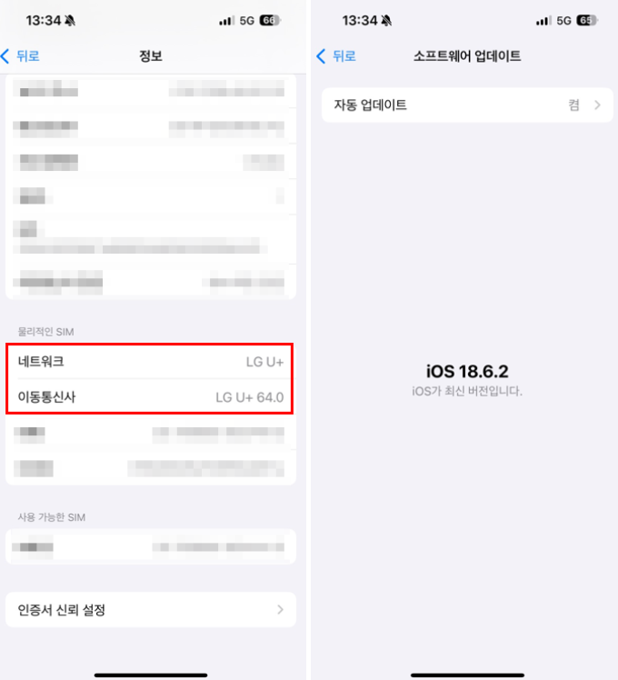 Wi-Fi 연결 상태에서 설정 → 일반 → 정보 → 통신사 확인