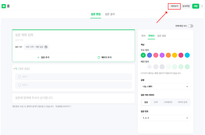 설문이 완성되면 상단의 ‘저장’을 눌러 저장하고,