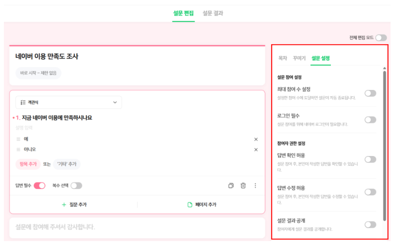 ‘설문 설정’에서는 다음 항목을 조정할 수 있습니다.
