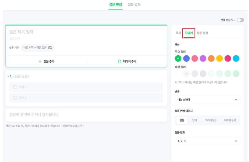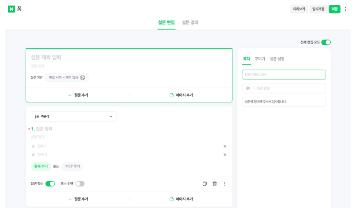질문 순서 변경, 페이지 추가, 글꼴 조정 등 세부 설정이 가능합니다.