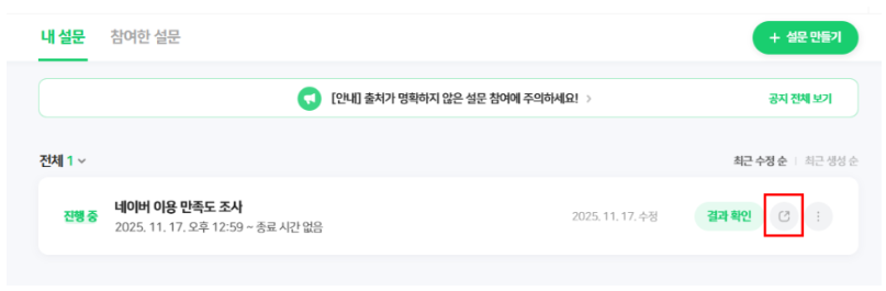 ‘내 설문’ 목록에서 공유할 항목을 선택합니다.