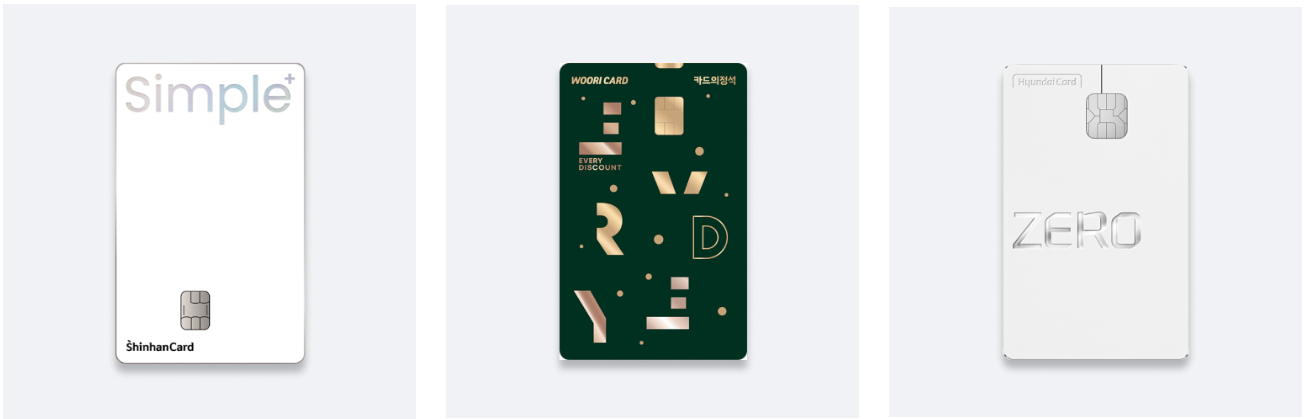 | 신한카드 Simple+ | 우리카드 카드의정석 EVERY DISCOUNT | 현대카드 ZERO Edition3 (할인형) |