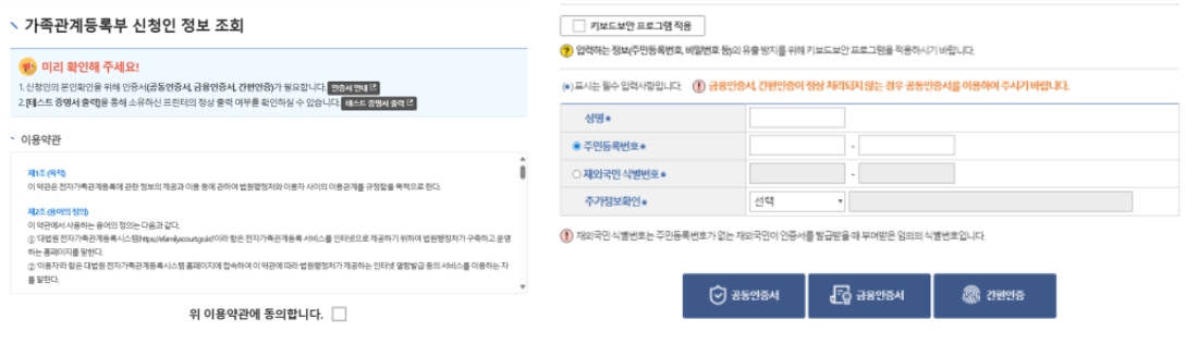 가족관계증명서 | 전자가족관계등록시스템 | 공동·간편인증 필요 |