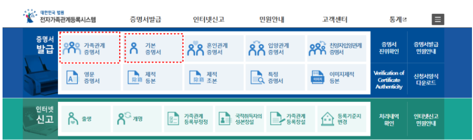 기본증명서 | 전자가족관계등록시스템 | 본인 및 가족 확인 가능 |