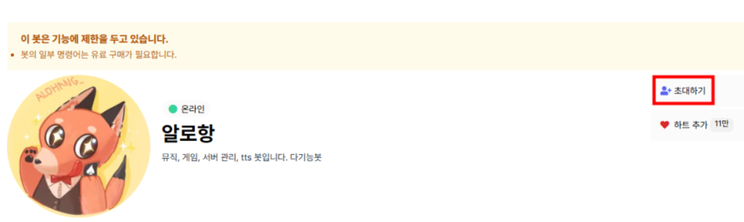 선택한 노래봇 페이지에서 '초대하기'를 클릭해