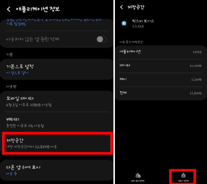 설정 > 애플리케이션 > 빅스비 > 캐시 삭제
