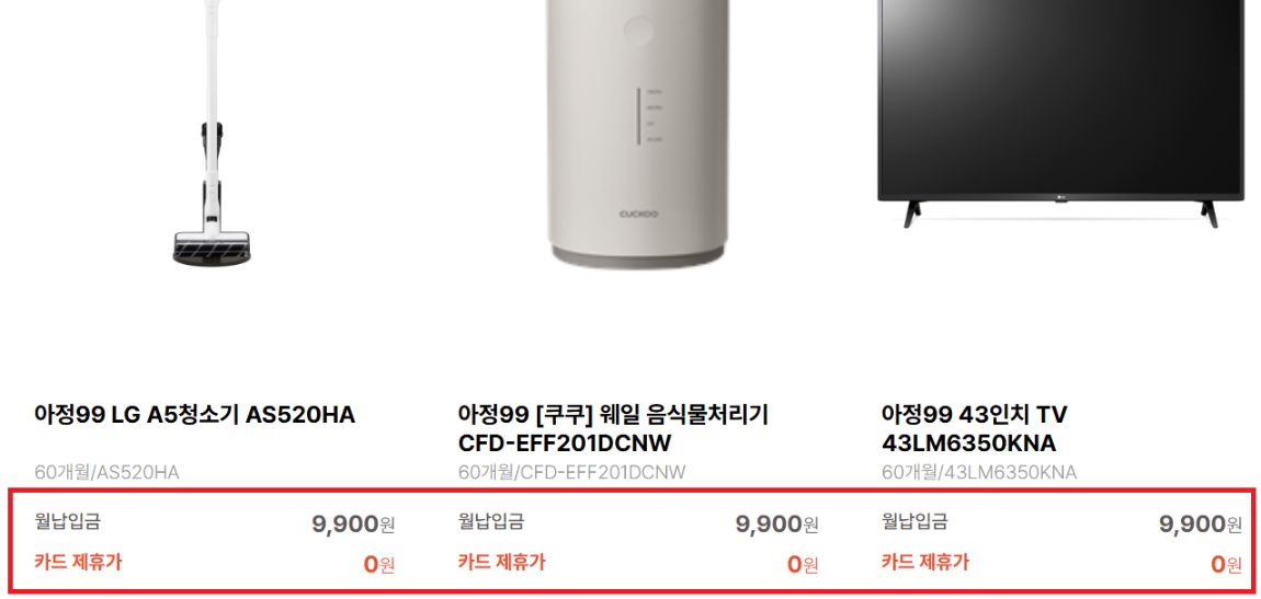 최소 9,900원으로 가전결합이 가능하고,