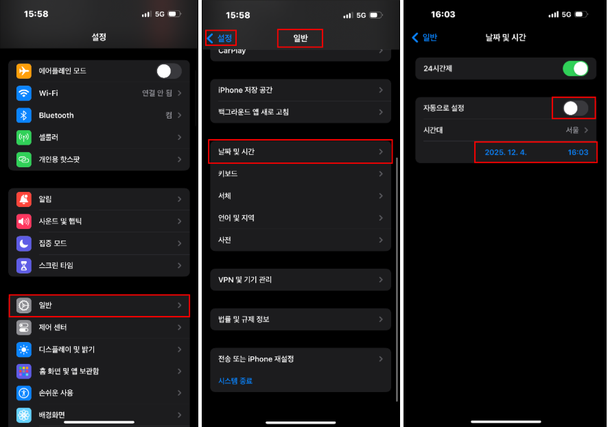 - 설정 → 일반 → 날짜 및 시간